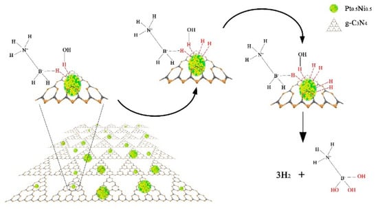 It is noted that assembling alloy with appropriate supports, such as metal oxides, carbon nanotubes, mesoporous carbon nitride, graphene, etc., emerges as one of the novel encouraging approaches to further improve the catalytic activities and stability [,,,,,,,]. It is well known that the supporting materials play a critical role in enhancing its catalytic properties due to the synergistic effects between alloy and supports. Graphitic carbon nitride (g-C3N4), a promising two-dimensional non-metal material, is regarded as a promising candidate owing to its attractive electronic structure, high nitrogen content, excellent chemical and thermal stability, and environment friendliness [,,,]. Chen et al. constructed Au−Co nanoparticles (Au−Co@CN), displaying exceedingly good catalytic activity with a TOF value reaching 2897 mol H2molmetal −1h−1 at 298 K []. Fan et al. reported the in-situ construction of g-C3N4 supported Rh NPs, giving a very high TOF value of 969 mol H2molRh −1h−1 []. Encouraged by these achievements, the construction of PtNi alloy anchored into g-C3N4 for hydrogen production from the hydrolysis of AB is of paramount significance and has rarely been reported. Additionally, investigating the construction of bi-metal NPs in g-C3N4 as well as the exploration of the synergistic effect between them are also of outmost importance.