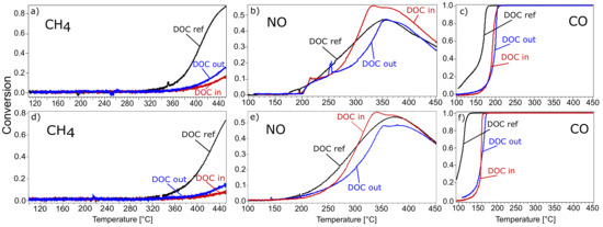 Conversion during heating of (a,d) CH4, (b,e), NO and (c,f) CO over the fresh oxidation catalyst (DOC ref) and the inlet (DOC in) and outlet (DOC out) of the engine bench aged oxidation catalyst. Top row (a–c), in a feed consisting of 1000 ppm CH4, 1000 ppm NO, 1000 ppm CO, 8% H2O, 5% O2, and argon as balance. Bottom row (d–f), in a feed consisting of 1000 ppm CH4 or 1000 ppm NO or 1000 ppm CO with 8% H2O, 5% O2, and argon as balance.