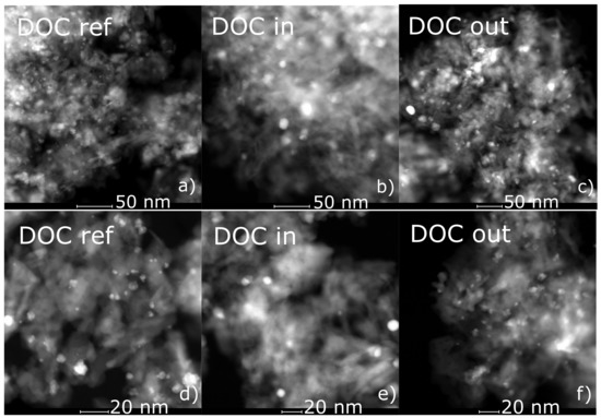 TEM images of (a,d) the fresh oxidation catalyst (DOC ref) and (b,e) the inlet (DOC in) and (c,f) outlet (DOC out) of the engine bench aged oxidation catalyst, at two magnifications, (a–c) and (d–f), respectively.
