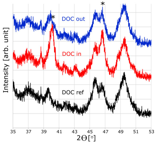 X-ray diffractograms for the fresh oxidation catalyst (DOC ref) and for the inlet (DOC in) and outlet (DOC out) of the engine bench aged oxidation catalyst. The diffraction patterns have been shifted in intensity for clarification, and full patterns between 30 and 90 degrees (2Θ) can be found in the Supporting Information. Diffraction peaks indicated by * show Pd.
