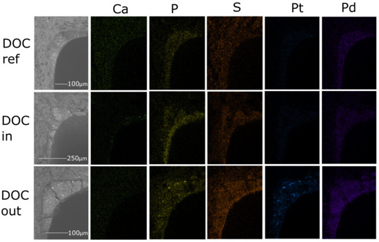 SEM images and EDX maps of Ca, P, S, Pt, and Pd for the fresh oxidation catalyst (DOC ref) and for the inlet (DOC in) and outlet (DOC out) of the engine bench aged oxidation catalyst.
