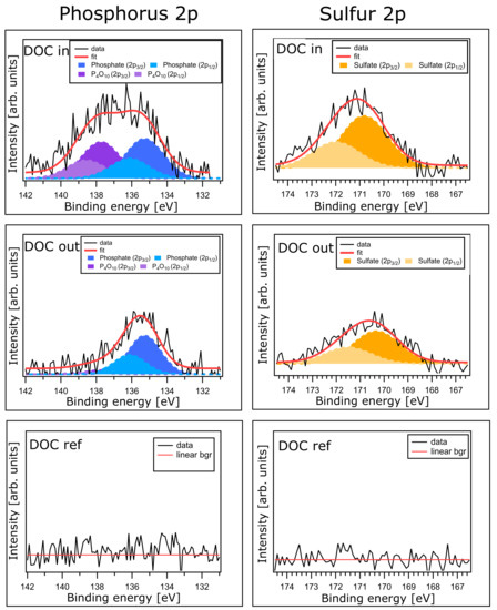Phosphorus and sulfur 2p core level spectra of the fresh oxidation catalyst (DOC ref) and of the inlet (DOC in) and outlet (DOC out) of the engine bench aged oxidation catalyst.