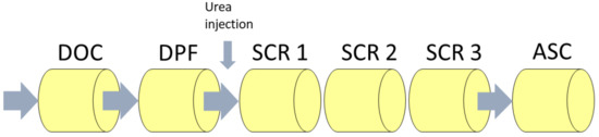 Emission control system setup with the oxidation catalyst (DOC), particulate filter (DPF), selective catalytic reduction (SCR) catalysts (SCR 1-3), and ammonia slip catalyst (ASC).