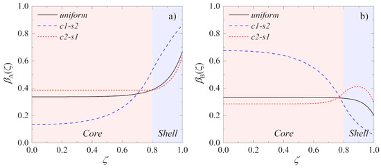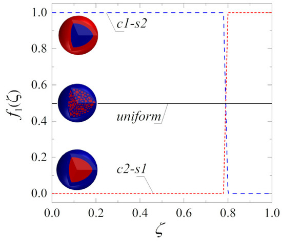 Three arrangements of catalyst 1 and catalyst 2 within the spherical pellet were examined, including a uniform distribution of the catalysts in the entire volume of the pellet and two non-uniform core–shell distributions. The first non-uniform distribution has catalyst 1 located in the core and catalyst 2 located in the pellet shell, and the second one has inverted arrangement of the catalytic active sites (Figure 2). In all cases, it was assumed that each type of catalyst occupies 0.5 volume fraction of the pellet. Therefore, in the case of the non-uniform core–shell distributions, a dimensionless radius of the pellet core is equal to .