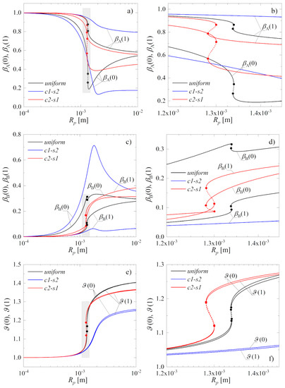 Figure 3 reports solution diagrams of the multifunctional catalyst pellet as a function of the pellet radius, Rp, for fixed values of the other parameters of the model. Abbreviations c1-s2 and c2-s1 denote, respectively, a core–shell structure with catalyst 1 in the core and catalyst 2 in the shell, and a core–shell structure with catalyst 2 in the core and catalyst 1 in the shell. Solid lines indicate stable steady states, whereas dashed lines denote unstable states. Variables and , and variables and are the dimensionless reactant concentration and temperature at the pellet center () and at its surface (), respectively. Figure 3b,d,f shows the enlargement of the areas marked, respectively, in Figure 3a,c,e, in which the occurrence of multiple steady-state states for uniform and c2-s1 configuration of the catalysts were observed.