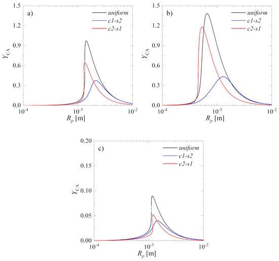 Figure 5 reports the yield, , as a function of the pellet radius Rp, calculated using Equation (6). Figure 5a shows the values of calculated from the solution presented in Figure 3. Figure 5b,c shows the values of obtained with one parameter changed with respect to the base case (Table 1), that is the frequency coefficient increased from to (Figure 5b) and the frequency coefficient increased from to (Figure 5c), respectively.
