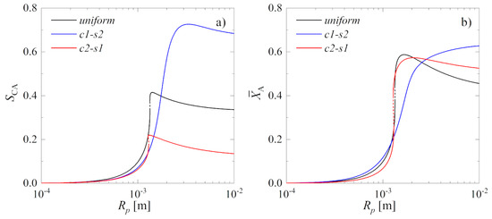 Figure 6a reports the selectivity, , determined for the base-case set of parameters (Table 1) as a function of the pellet radius, Rp.