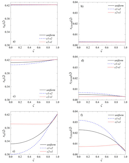 Figure 7 shows representative profiles of the hydrogen and methanol molar fractions obtained for T = 493 K using uniform, c1-s2 and c2-s1 arrangement of the metallic and acidic active centers within the pellet of the radius: m (Figure 7a,b), m (Figure 7c,d) and m (Figure 7e,f). Computations performed for the smallest of the analyzed radii predict that both hydrogen (Figure 7a) and the intermediate product, i.e., methanol (Figure 7b), are computed as distributed uniformly in the entire volume of the pellet, regardless of the employed arrangements of the catalytic active centers. As the pellet size increases, the catalyst arrangement begins to have an effect on the intraparticle concentration profiles of reactants. Moreover, for the largest radius (Figure 7e,f) the concentration profiles qualitatively resemble those obtained for the system of two elementary chemical reactions (Figure 4). This suggests similar relationships between the values of the product yield that can be achieved using different structures of the pellet.