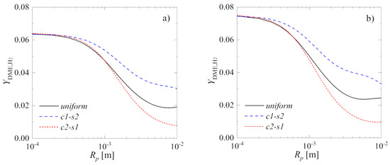 Yield of DME with respect to hydrogen, , as a function of the pellet radius, Rp: (a) for the process temperature T = 493 K; (b) for the process temperature T = 503 K.