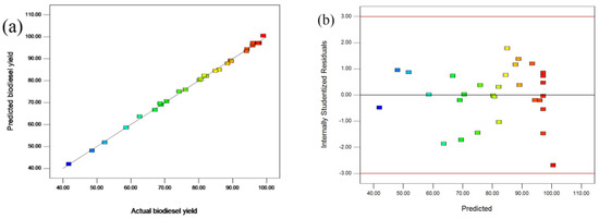 The goodness of fit of the model equation should be evaluated before it was used to predict the actual biodiesel yield. The determination coefficient (R2) of 0.9985 and adjusted determination coefficient (Adj-R2) of 0.9972 both showed the better aptness of the model. Meanwhile, the “Pred-R2” of 0.9929 was in reasonable agreement with the “Adj-R2” further suggested that the equation had better regression and fitting degree. Non-significant “lack of fit” (p = 0.2704) further indicated that the fitting between model and experimental data was satisfactory (Figure 5a). The applicability of the equation could also be analyzed using the plot of residuals versus predicted response (Figure 5b). Irregular distribution of data suggested the model was adequate and no violation of independence or constant variance assumption existed in the model [42]. Figure 5c showed the normal probability plot of the residuals. The data distributed normally in straight approximate lines indicated that the errors were insignificant. The simultaneous effect of all the factors on the yield was shown in Figure 5d. The perturbation graph revealed that the production process was most sensitive to CALB@SNFs dosage and least affected by the molar ratio of methanol to oil.
