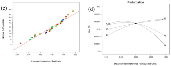 (a) predicted versus experimental biodiesel yield; (b) plot of the residuals versus the predicted response; (c) normal probability plots of residuals; (d) perturbation plot showing the influence of variables on biodiesel yield.