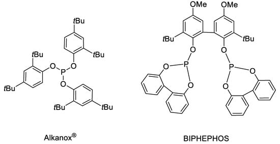 The hydrolytic stability of phosphites is an important issue in industrial processes, because water will inevitably be formed during hydroformylation as a by-product of the aldol condensation of the product aldehydes. Therefore, the study of their behavior towards water is of crucial importance for the design of new ligands, as well as adjusting proper reaction conditions. Of course, measures against hydrolysis should not affect the catalytic properties of the ligands. In the literature, some phosphites are described which combine both desired properties. Prominent examples are the monodentate ligand Alkanox® (also named Alkanox 240) [11,12,13,14,15] and the bidentate ligand Biphephos [16,17,18] (Figure 1). Both are decorated with several tert-butyl groups.