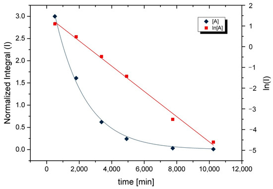 When the concentrations of starting material A are plotted against time t, an exponential curve results. Logarithm, on the other hand, provides a linear correlation for the decrease in concentration of the starting product. The exemplary plots of 2a are shown in Figure 3.