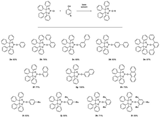 Phosphorchloridite 2-chloro-4,4,5,5-tetraphenyl-1,3,2-dioxaphospholane (1), the unsubstituted benzopinacolphosphite 2-phenoxy-4,4′,5,5′-tetraphenyl-1,3,2-dioxaphospholane (2a), the four phenyl-substituted benzopinacolphosphites 2-([1,1′-biphenyl]-2-yloxy)-4,4,5,5-tetraphenyl-1,3,2- dioxaphospholane (2b), 2-([1,1′-biphenyl]-3-yloxy)-4,4,5,5-tetraphenyl-1,3,2-dioxaphospholane (2c), 2-([1,1′-biphenyl]-4-yloxy)-4,4,5,5-tetraphenyl-1,3,2-dioxaphospholane (2d), 2-([1,1′:3′,1″-terphenyl]- 2′-yloxy)-4,4,5,5-tetraphenyl-1,3,2-dioxaphospholane (2e), the three benzopinacolphosphites with condensed ring systems 2-(naphthalen-1-yloxy)-4,4,5,5-tetraphenyl-1,3,2-dioxaphospholane (2f), 2-(naphthalen-2-yloxy)-4,4,5,5-tetraphenyl-1,3,2-dioxaphospholane (2g), 2-(anthracen-9-yloxy)- 4,4,5,5-tetraphenyl-1,3,2-dioxaphospholane (2h) and the four benzopinacolphosphites with tert-butyl-substituents 2-(4-(tert-butyl)phenoxy)-4,4,5,5-tetraphenyl-1,3,2-dioxaphospholane (2i), 2-(2,4-di-tert-butylphenoxy)-4,4,5,5-tetraphenyl-1,3,2-dioxaphospholane (2j), 2-(2,6-di-tert- butylphenoxy)-4,4,5,5-tetraphenyl-1,3,2-dioxaphospholane (2k) and 4,4,5,5-tetraphenyl-2-(2,4,6-tri- tert-butylphenoxy)-1,3,2-dioxaphospholane (2l) were synthesized. Detailed synthesis procedures and experimental data are given in the supporting information. The structures and yields are shown in Figure 6.