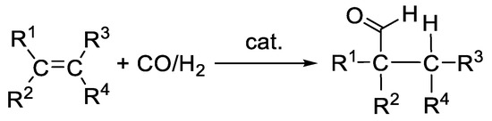 The hydroformylation of olefins is one of the most relevant, industrially applied chemical transformations worldwide [1,2,3,4,5,6]. The annual production of over 10 million tons of aldehydes reflects its importance [1,3]. Principally, hydroformylation is the reaction of syngas—a mixture of hydrogen and carbon monoxide—with olefins under the formation of aldehydes (Scheme 1). Formally, this reaction can be described as the addition of hydrogen and a formyl group to the double bond of the alkene in an atom-economical manner. Aldehydes themselves are not only valuable final products in bulk and fine-chemistry, but also important intermediates for further reactions [1,3,7]. They can be, for example, transformed into alcohols by reduction, to carboxylic acids by oxidation, or to amines by reductive amination.