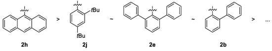 The highest yields after 4 h of reaction time were found using phosphites 2b, 2e, 2f and 2h—each at over 97% (Table 2, entries 2, 5, 7 and 11). Taking the rate constant kobs. into account, ligands 2b, 2e, 2h and 2j induced the highest activity (entries 2, 5, 11 and 15). Generally, substituents in an ortho-position, especially electron-accepting phenyl-substituents and condensed aromatic systems, allowed for the achievement of high activities. However, tert-butyl groups (2j, entry 15) may also contribute beneficially to the activity. The following general tendency can be derived (Scheme 4).