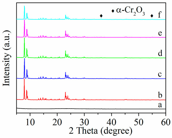 XRD patterns of the catalysts. (a) 3%Cr/SBA, (b) 0.5%Cr/S-1, (c) 1%Cr/S-1, (d) 2%Cr/S-1, (e) 3%Cr/S-1, (f) 7%Cr/S-1.