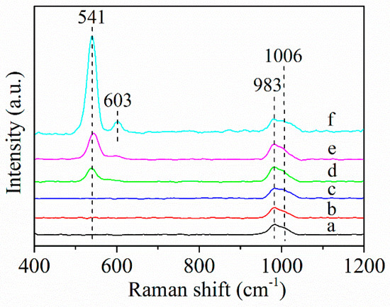 Raman spectra of the catalysts. (a) 0.5%Cr/S-1, (b) 1%Cr/S-1, (c) 2%Cr/S-1, (d) 3%Cr/S-1, (e) 7%Cr/S-1, (f) 3%Cr/SBA.