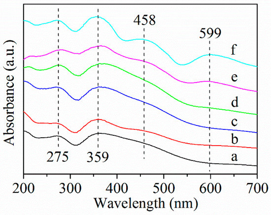 The bands at 275 and 359 nm on the diffuse reflectance UV-vis spectra of the Cr/S-1 and 3%Cr/SBA catalysts are attributed to tetrahedral Cr6+ species, while the ones at 458 and 599 nm are assigned to octahedral Cr3+ species existing in Cr2O3 or CrOx clusters (Figure 3) [36,38]. The band at 599 nm cannot be found for the Cr/S-1 catalysts until the Cr content of 7%. 3%Cr/SBA shows the strongest intensity of this band, suggesting the worse dispersion of chromium oxide on 3%Cr/SBA than 3%Cr/S-1. The above result is consistent with those of XRD and STEM mapping.