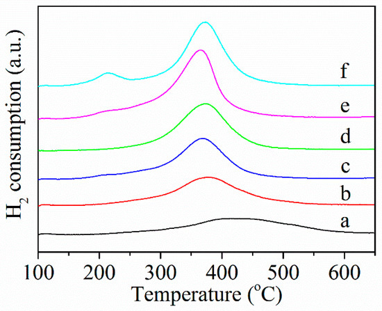 Temperature-programmed desorption of NH3 (NH3-TPD), temperature-programmed reduction of H2 (H2-TPR), and temperature-programmed oxidation (TPO) characterizations were performed on an AutoChem II instrument (Micromeritics, Atlanta, GA, USA). We pretreated 0.1 g of sample (40–60 mesh) in situ at 550 °C in N2 flow for 1 h before the measurement. In the case of NH3-TPD experiment, the temperature was cooled to 80 °C, and the flow was changed to 10 vol.% NH3/He (30 mL/min) and maintained at 80 °C for 2 h, followed by being swept with He (30 mL/min) for 2 h. Then, the sample was heated in He (30 mL/min) to 600 °C at a ramp rate of 10 °C/min. In the case of H2-TPR experiment, the temperature was cooled to 100 °C, and the flow was switched to 10% H2/Ar (30 mL/min), followed by heating to 650 °C at a ramp rate of 10 °C/min. In the case of TPO experiment, the temperature was cooled to 150 °C, and the flow was changed to 3% O2/He (30 mL/min), followed by heating to 650 °C at a ramp rate of 10 °C/min. Diffuse reflectance infrared Fourier transform spectroscopy (DRIFTS) spectra were recorded at 300 °C on a Nicolet 6700 spectrometer (ThermoFisher, Waltham, MA, USA) equipped with an MCT detector and a heating accessory. The sample was pretreated in situ in flowing He (30 mL/min) at 450 °C for 1 h before the measurement.