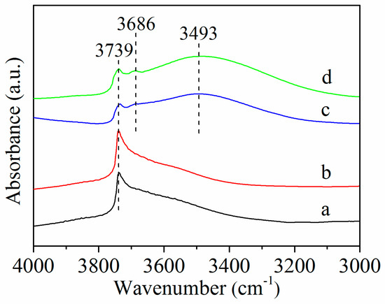 As revealed in Figure 5, silicalite-1 zeolite has three kinds of hydroxyl groups: Isolated silanol groups (3739 cm−1), vicinal silanol groups (3686 cm−1), and nest silanol groups (3493 cm−1) [27,43,44]. After supporting chromium oxide, the intensities of these -OH groups, particularly the nest silanol groups, diminish. The peak area ratio of nest silanol groups to isolated silanol ones declines from 16 to 5.0 after supporting chromia (3%Cr). This observation suggests that the number of silanol groups decreases via the interaction of Cr species with the -OH groups [29,44,45]. SBA-15 has only isolated silanol groups. Supporting chromium oxide on SBA-15 also leads to a decrease in the number of hydroxyl groups. The nest silanols have a higher local density of hydroxyls than isolated silanols [46], thus resulting in a stronger interaction between chromium species and nest silanols. Therefore, the better dispersion of chromium species on silicalite-1 than SBA-15 can be attributed to the abundant nest silanol groups present on the former support.