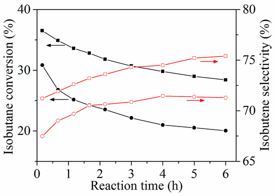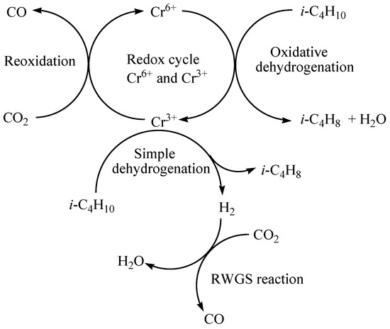 Isobutene is an important industrial chemical employed to produce butyl rubber, gasoline oxygenates (e.g., ethyl tert-butyl ether), and antioxidants (e.g., butylated hydroxyanisole) [1,2]. Its two main manufacture ways which rely on the source of petroleum, i.e., steam cracking of naphtha as well as fluidized catalytic cracking, cannot meet the increasing requirements. Due to the shortage of petroleum and environmental consideration, the dehydrogenation of small alkanes to alkenes assisted by CO2 has attracted more attention recently [3,4,5,6,7,8,9,10,11,12,13]. Compared to the oxidative dehydrogenation of light alkanes with O2, the beneficial employment of CO2 as a soft oxidant comprises improving the product selectivity as well as decreasing CO2 emissions [14,15]. Moreover, this route opens up a new way to utilize greenhouse CO2.