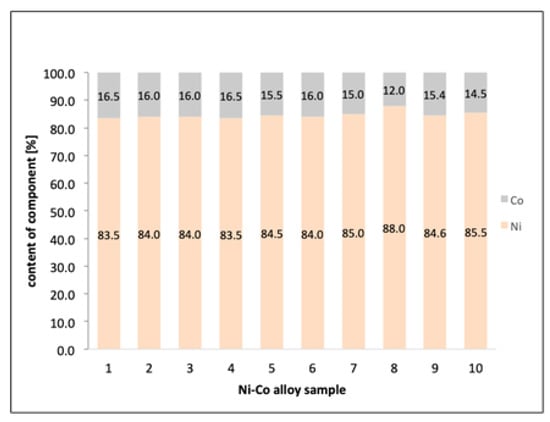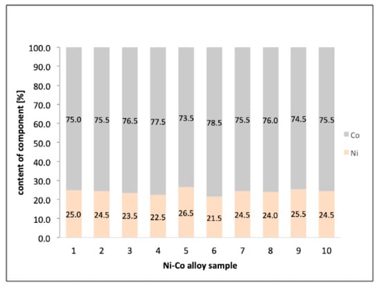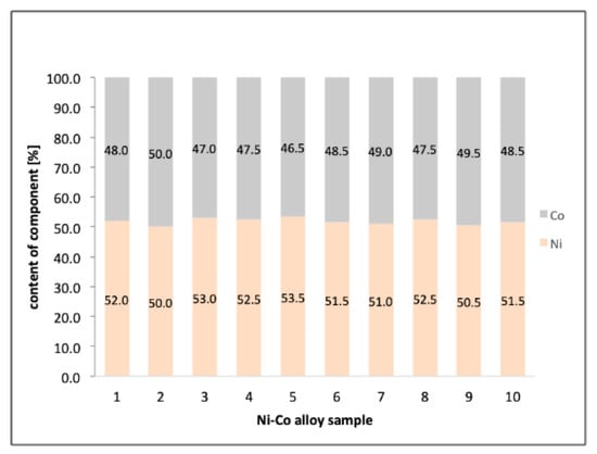 For further research, the following Ni–Co alloy samples were selected: 7 (15% of Co; Figure 1), 5 (25% of Co; Figure 2), 2 (50% of Co; Figure 3), and 1 (75% of Co; Figure 4).