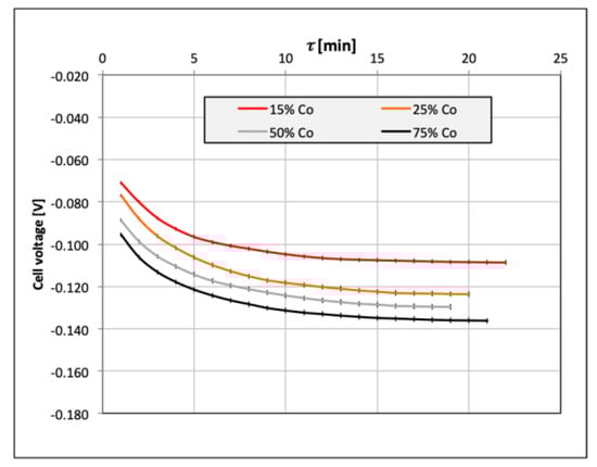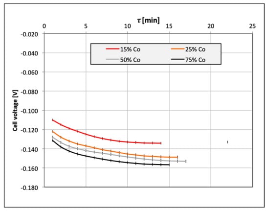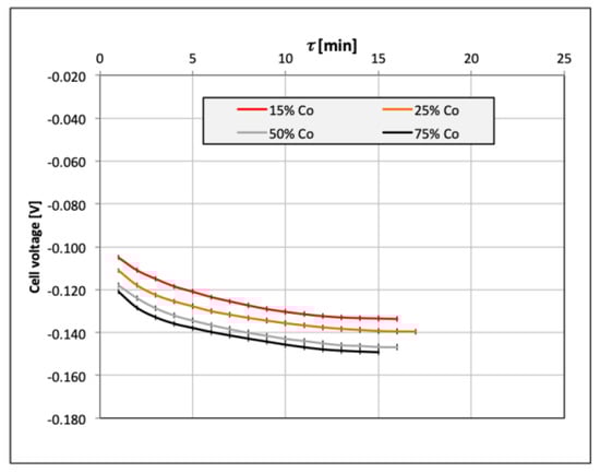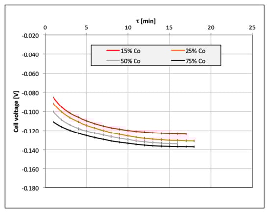 The data (Figure 5, Figure 6, Figure 7, Figure 8, Figure 9 and Figure 10) show that during each measurement, the electroless potential was the highest for the Ni–Co catalyst with 15% of Co. Moreover, the highest electroless potential was obtained for Ni–Co electrodes oxidized for 8 h (Figure 9).