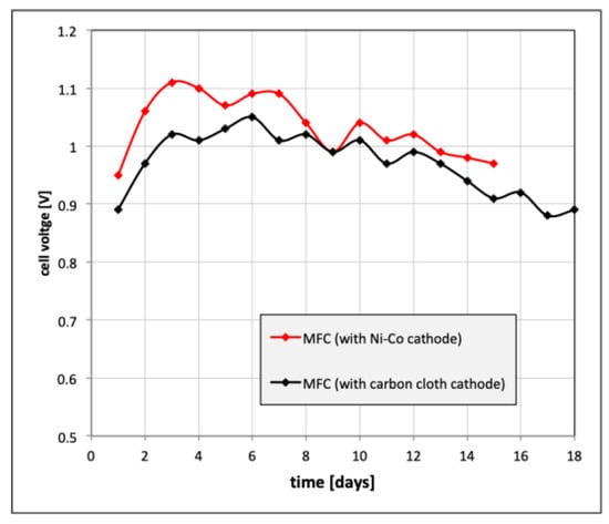 Cell voltage of the MFC in time: red line—with Ni–Co cathode (15% Co), black line—carbon cloth cathode.