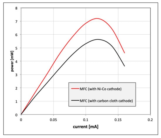 The maximum power obtained during the operation of MFC with Ni–Co alloy was slightly higher (by 1.56 mW) than the maximum power obtained during the operation of MFC with the carbon cloth cathode (Figure 16), and slightly higher (by 1.08 mW) than the maximum power obtained during the operation of MFC with the Cu–B cathode [,].