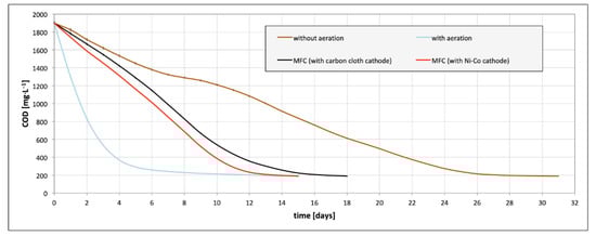 The measurements concerned with COD reduction also demonstrated that in each of the analyzed cases (without aeration, with aeration, and using MFC), the assumed level of reduction was 90%. The time of COD reduction using MFC with Ni–Co cathode (15% Co) to the assumed level of 90% was 15 days (Figure 15). The time obtained was shorter (by 3 days) than the time of COD reduction using MFC with a carbon cloth electrode, and also shorter than when an electrode with a Cu–B catalyst was applied [,].