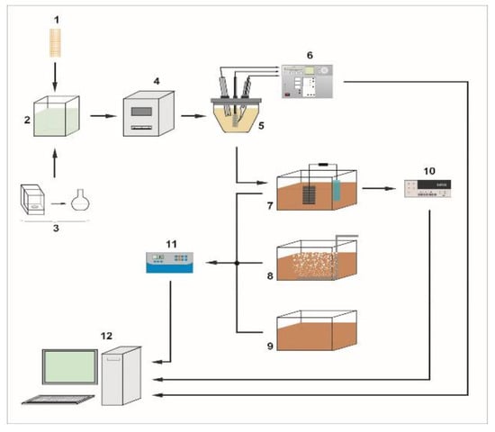 Scheme of the measurements: 1—copper mesh (electrode) to deposit the catalyst, 2—electrolysis bath to deposit the catalyst, 3—electrolyte preparation, 4—furnace for electrode (catalyst) oxidation, 5—glass cell for electroless potential analysis and for the anodic charge analysis, 6—potentiostat, 7—third reactor (MFC), 6—second reactor (with aeration), 9—first reactor (without aeration), 10—multimeter, 11—colorimeter, 12—computer.