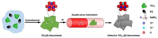 The TiO2(B) phase commonly suffers from phase transformation into the stable TiO2 phase (anatase or rutile) in high-temperature annealing conditions, owing to the thermodynamically metastable structure. Thus, this work provides a new and simple dual-zone NaBH4 reduction approach to produce defective TiO2−x(B) nanosheets (Figure 1), showing the potential to replace the dangerous high-temperature hydrogenation method by directly using H2 as reductant reagent. Moreover, the byproducts residues from decomposition reactions of NaBH4 can be also avoided. Taking the advantage of the dual-zone reduction synthetic procedure, the phase transformation of TiO2(B) was inhibited, achieving self-doping of Ti3+ and simultaneous formation of oxygen vacancy sites.