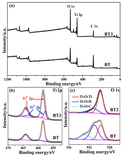 As shown in Figure 5a, the XPS survey spectra show the similar surface components of Ti and O elements in BT and BT3. The narrow scan XPS spectra of Ti 2p show that the binding energies of the spin doublet with Ti 2p3/2 and 2p1/2 are 458.4 and 464.1 eV, respectively (Figure 5b). The result indicates that the Ti species mainly exist as Ti4+, which is in good accordance with the literature results [29]. Moreover, the devolution of the Ti 2p XPS spectrum for the BT3 sample results in the obvious peaks belonging to Ti3+, for which the Ti 2p1/2 and Ti 2p3/2 peaks are located at about 457.5 and 463.2 eV, which confirms the generation of surface Ti3+ in TiO2(B). Such differences can be ascribed to the reduction of Ti4+ into Ti3+ after the NaBH4 treatment. As represented in Figure 5c, the deconvoluted peaks of O1s at 529.7, 531.0, and 532.8 eV are due to the lattice oxygen (Ti–O–Ti), surface hydroxyl group/O–defective matrix (Ti–O–H), and Ti–O–C groups, respectively [30,31,32]. The observation of Ti–O–C groups can be attributed to the surface-absorbed ethylene glycolate [26]. More interesting, the amount of lattice Ti–O–Ti bonds relative to surface Ti–O–H bonds/O–defective matrix was notably increased in BT3, as compared to those of BT. The results indicate the simultaneous production of oxygen vacancy sites [26,32].