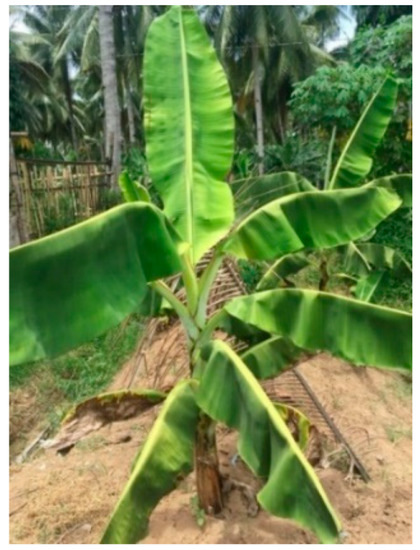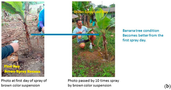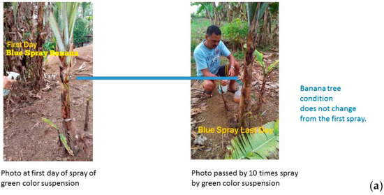 Banana (Musa spp.) is a staple food for more than 400 million people, and over 40% of world production and virtually all the export trade is based on the Cavendish banana. However, the Cavendish banana is under threat from a virulent fungus, Fusarium oxysporum f. sp. cubense (FOC), Tropical race 4 (TR4), for which no acceptable resistant replacement has been identified [18]. FOC infection causes the oxidative stress to the banana and the development of stacked antimicrobial genes in the banana also is studied [19]. The photograph in Figure 1 shows the early symptoms such as wilting and leaf-yellowing of the banana tree in this experimental field in the Philippines. An typical example of an infected banana tree is shown in the reference [18], which indicates that the disease caused the yellowing and dropping of the leaves, known as the pseudostem cracking. The typical example shows more brown leaf structure and plant collapse. In the experiment, the suspensions of green tuff powder and calcined green tuff powder were sprayed on the infected banana trees periodically and the situation of the banana trees was observed after about one month. As the green tuff does not dissolve in water, the green tuff powder and water suspension are environmentally friendly materials.
