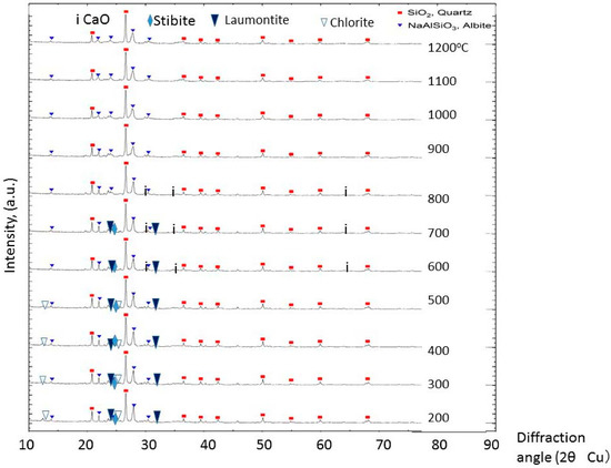 The green tuff powder was calcined at temperatures ranging from 200 °C to 1200 °C for 30 min, and the calcined powder was then kept dry. XRD patterns of each calcined powder are shown in Figure 2, which indicates mainly quartz and albite peaks. Chlorite peaks exist in the green tuff calcined at 500 °C, however, they disappear at temperatures higher than 600 °C. Green color chlorite disappears by calcination at higher than 600 °C and Fe2+ in chlorite has oxidized to Fe3+. Albite is stable at all calcined temperatures. Stilbite and laumontite exist at temperatures lower than 700 °C and they disappear at temperatures higher than 800 °C. Both zeolite of stilbite and laumontite contain Ca and as they decompose, small peaks of CaO appear between 600 °C and 800 °C, while it was disappeared at temperature above 900 °C.