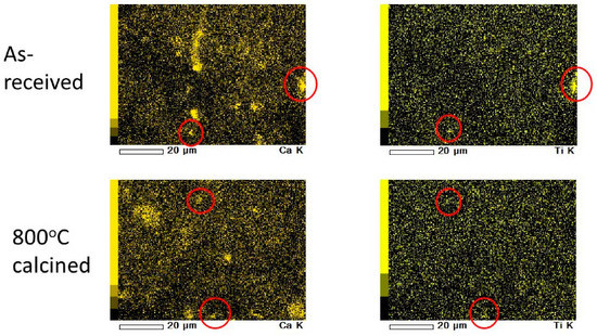 EDS elemental maps of Ca and Ti for as-received green tuff (top two photos) and 800 °C calcined green tuff powder (bottom two photos). The Ca and Ti corresponding places are shown in the red circle marks.