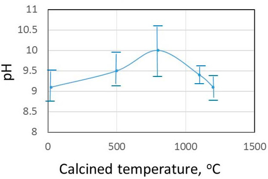 Instead of the production radical, in this experiment the reaction of the already prepared oxygen species (H2O2, OH, O2−) in water by adding green tuff and calcined powders are investigated. The effect of pH on the calcined temperature of green tuff by dispersing 1 wt% of powder in water is shown in Figure 7. The green tuff powder calcined at around 800 °C shows higher pH compared with the original green tuff one, while the higher than 1100 °C calcined tuff powder suspension shows lower pH. As shown in Figure 2 the CaO (small peaks) is observed from 600 °C to 800 °C and that dissolved is responsible for increasing the pH. The pH increase by calcination is similar to the calcined dolomite [23]. The hydrogen peroxide is unstable at higher pH [17], it means that the alkaline solution can decompose it, and it is noteworthy that the 800 °C calcined green tuff has a large decomposition ability.