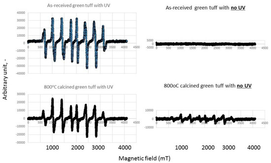 ESR spectra with or without UV illuminated for hydrogen peroxide solution (0.1 w/v%) for as-received green tuff as well as 800 °C calcined green tuff is shown in Figure 8. Only H2O2 solution does not produce a hydroxyl radical, however, the 800 °C calcined tuff powder addition produces the hydroxyl radical without UV irradiation. Under UV, both solutions showed the hydroxyl radical peaks largely, while by the addition of calcined powder, the hydroxyl radical peak is smaller than only the H2O2 solution. H2O2 decomposition to hydroxyl radical has already started with the addition of powder.