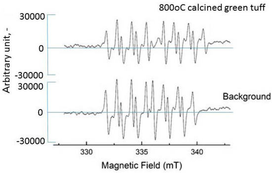 ESR spectra of G-CYPMPO-trapped adduct in superoxide solution (above) and for 800 °C calcined green tuff (above) and no additive of powder as background (below).