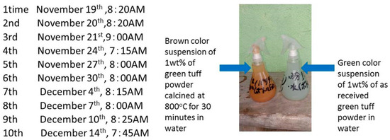 Spraying times and photographs of two kinds of suspension. (Green color suspension dispersing as-received green tuff powder in water and brown color suspension dispersing 800 °C 30 min calcined green tuff powder).