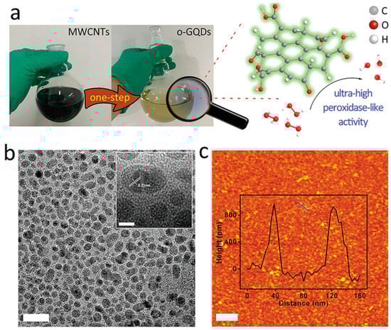 (a) Schematic representation of the preparation of graphene quantum dots (GQDs). (b) TEM image of GQDs. The scale bar is 20 nm. (c) Atomic force microscope image of GQDs. Reproduced from Reference [14] with permission from Wiley.