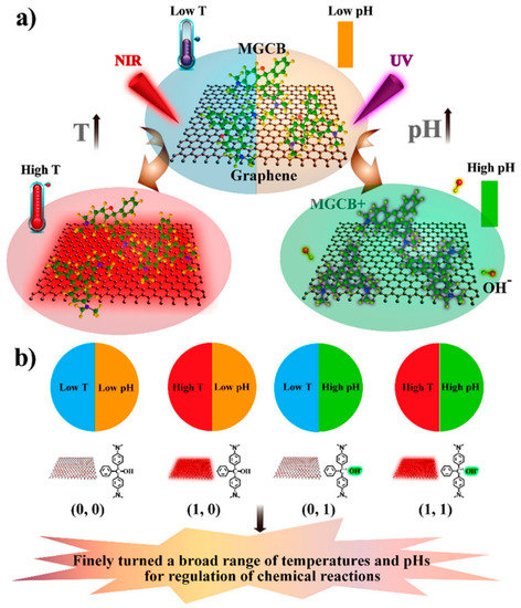 (a) Photothermal effect of graphene and light-induced pH changing the effect of malachite green carbinol base (MGCB). (b) Finely tuned a broad range of temperatures and pHs for the regulation of chemical reactions. Reproduced from Reference [75] with permission from The American Chemical Society.