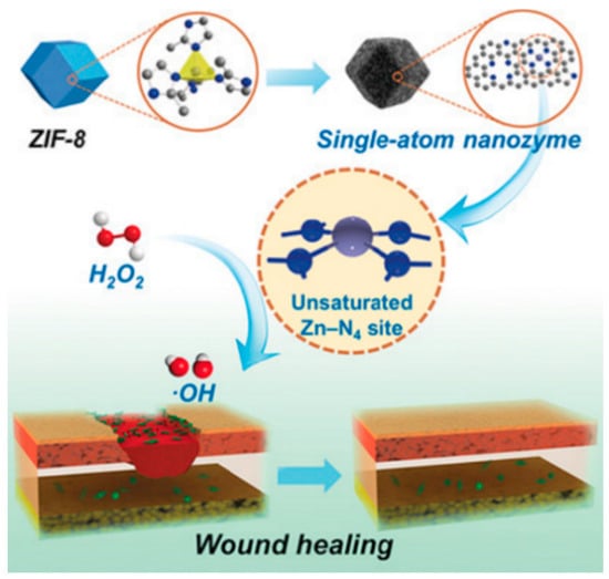 Schematic representation of zinc-based zeolitic-imidazolate-framework (ZIF-8) derived Zn–N–C single-atom nanozyme for wound antibacterial application. Reproduced from Reference [85] with permission from Wiley.