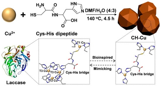Schematic representation of a new CH–Cu nanozyme via the coordination of Cu+/Cu2+ with a Cys-His dipeptide for the degradation of chlorophenols and bisphenols. Reproduced from Reference [90] with permission from Elsevier.