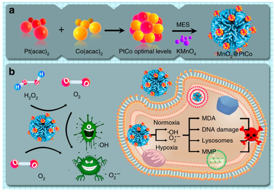 Schematic representation of (a) the synthesis of MnO2@PtCo nanoflowers and (b) the generation mechanism of reactive oxygen species (ROS) and cytotoxicity by MnO2@PtCo nanoflowers under different oxygen tensions. Reproduced from Reference [100] with permission from The Nature Publishing Group.