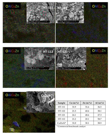 SEM analysis, reported in Figure 5, showed how the chemical composition of the investigated samples affected the final morphology of the system. In particular, the HT-111 and HT-122 samples exhibited a very porous sponge-like structure composed of predominantly elongated grains (>0.5 µm), whose uniform distribution per unit of surface revealed that some of the CuO species were embedded in the oxide carriers (i.e., ZnO and/or Al2O3). Moreover, on HT-112, an evident segregation of large oxide agglomerates of Al2O3 (light blue pots) was observable, contrarily to HT-121, where a denser granular structure favored the enrichment of copper species (red pots) among the carrier oxides. Regarding the reference commercial CuZnAl sample, a squamaceous plate-like structure evidenced an important lack of homogeneity in the distribution of the elements, characterized by a general lower porosity, as confirmed by BET analysis. In any case, the EDAX results on the investigated systems showed an elemental concentration in line with the design composition.