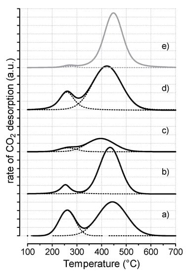Moreover, considering that CO2 affinity of the hydrotalcite-like catalysts is strongly dependent on the atomic composition and activation conditions [], CO2 desorption measurements were performed on the investigated catalysts, with profiles and quantitative data reported in Figure 6 and Table 3, respectively. It can be recognized that the strength of basic sites was determined by the adsorption and desorption peak of CO2 in the corresponding temperature range: weak–medium basic sites (below 300 °C) and strong basic sites (above 300 °C).