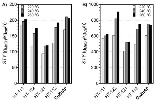Space–time yield of methanol (STY) calculated per (A) mass of catalyst and (B) Cu loading (PR, 30 bar; GHSV: 8800 NL/kgcat/h).