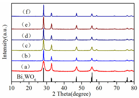XRD patterns of prepared Bi2WO6 samples under different temperature and pH. (a) 140 °C, pH = 1; (b) 140 °C, pH = 7; (c) 180 °C, pH = 1; (d) 180 °C, pH = 7; (e) 220 °C, pH = 1; (f) 220 °C, pH = 7.